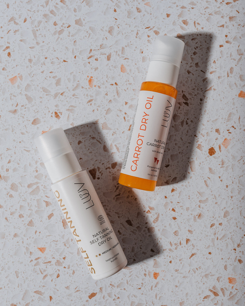 While imparting a tan, our self-tanning dry oil also cares for your skin – carrot oil deeply moisturizes, aloe soothes, and antioxidants along with vitamin E help maintain youthful skin. Additionally, it contains natural self-tanning ingredients that don’t dry out the skin and are suitable even for sensitive skin. LUUV’s natural self-tanning dry oil will transform you into a true sun goddess!